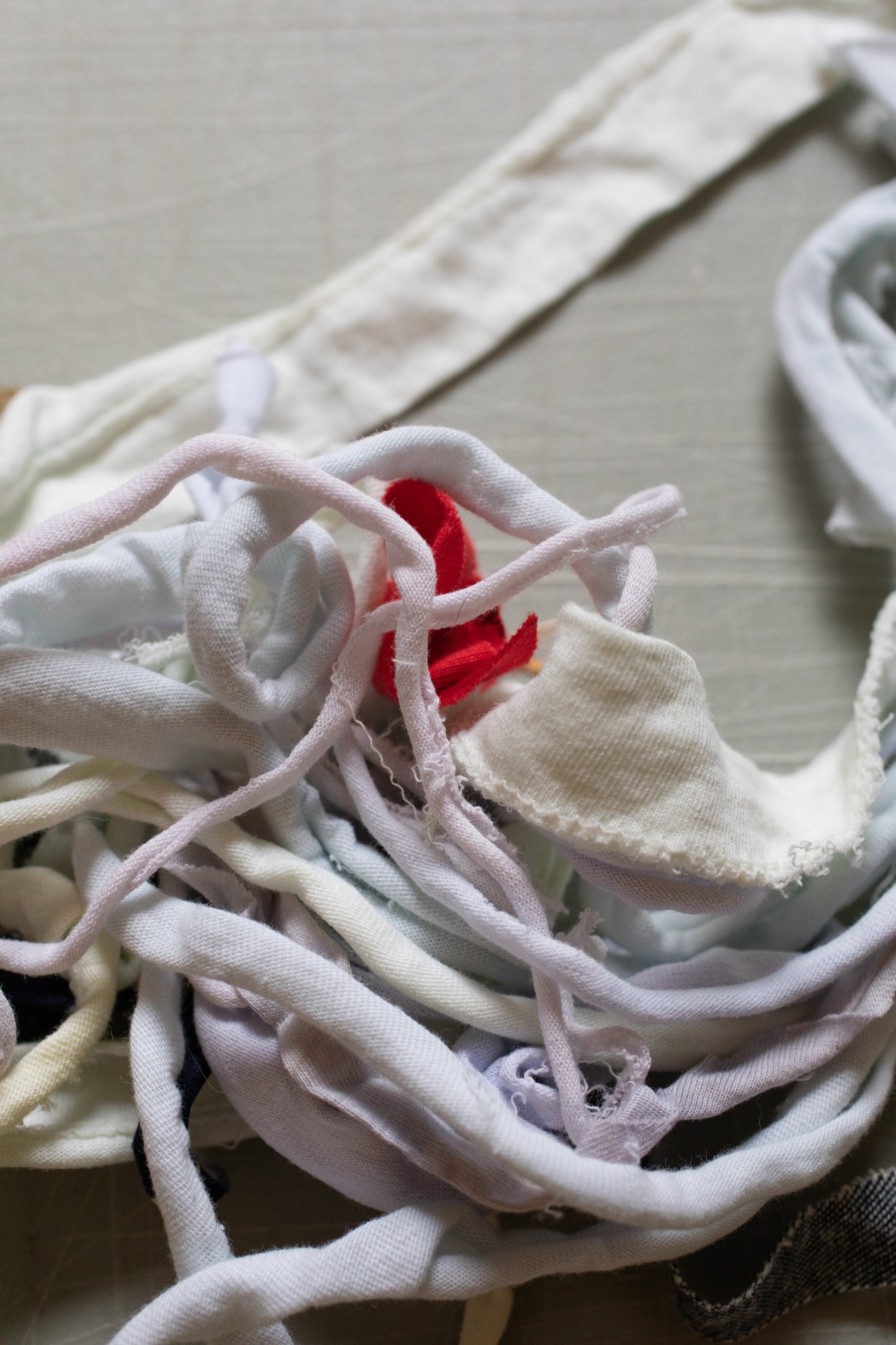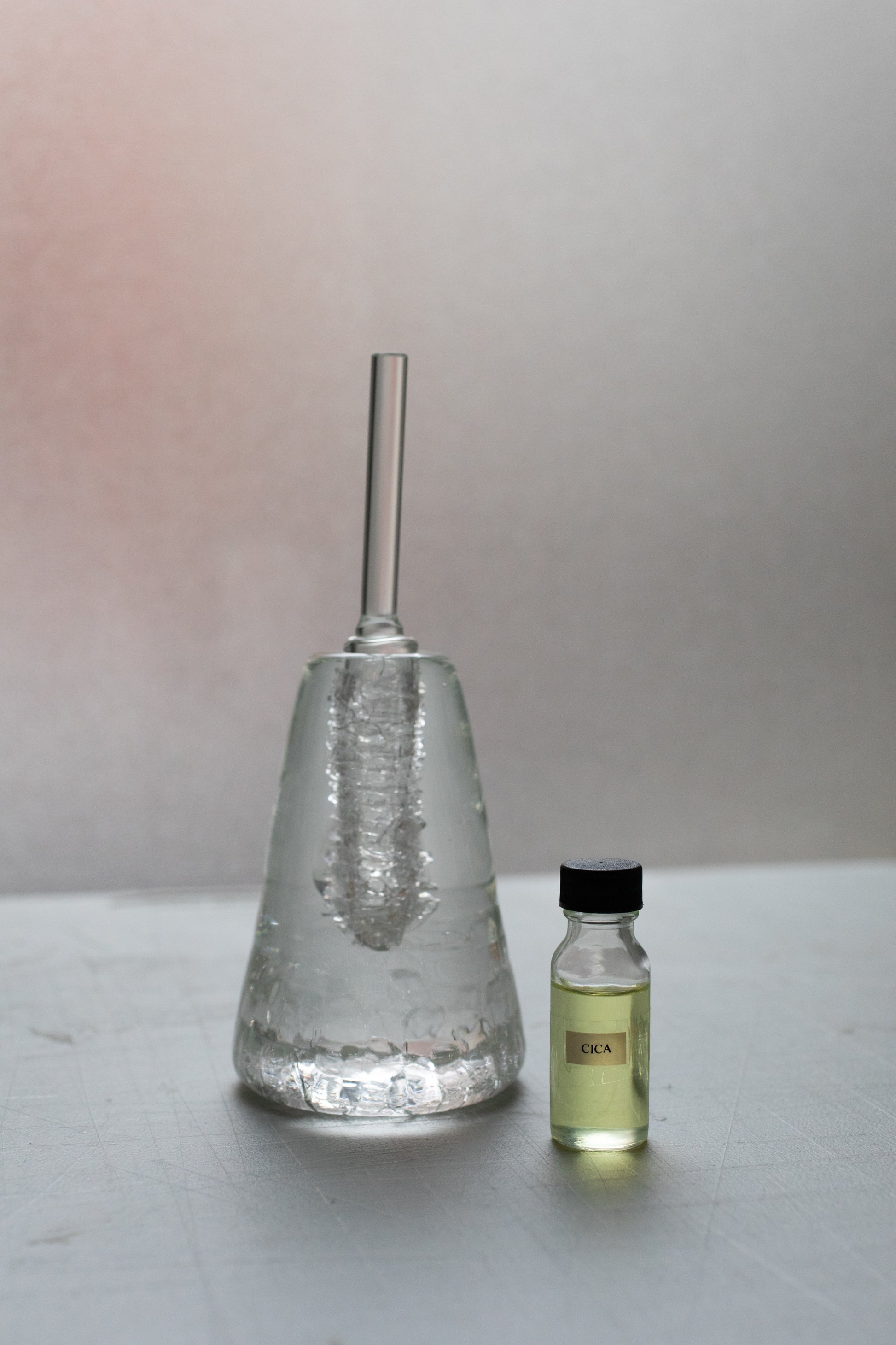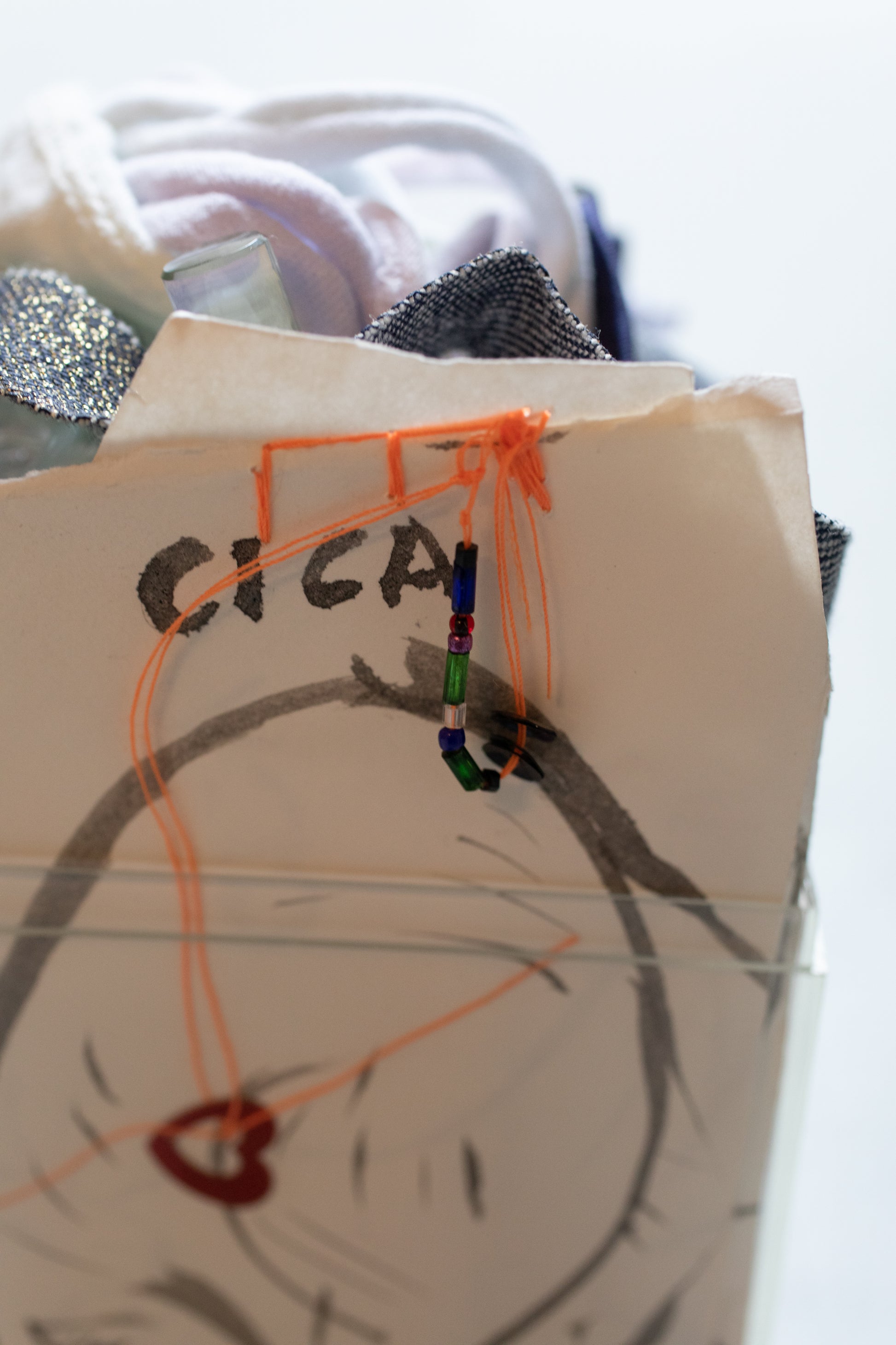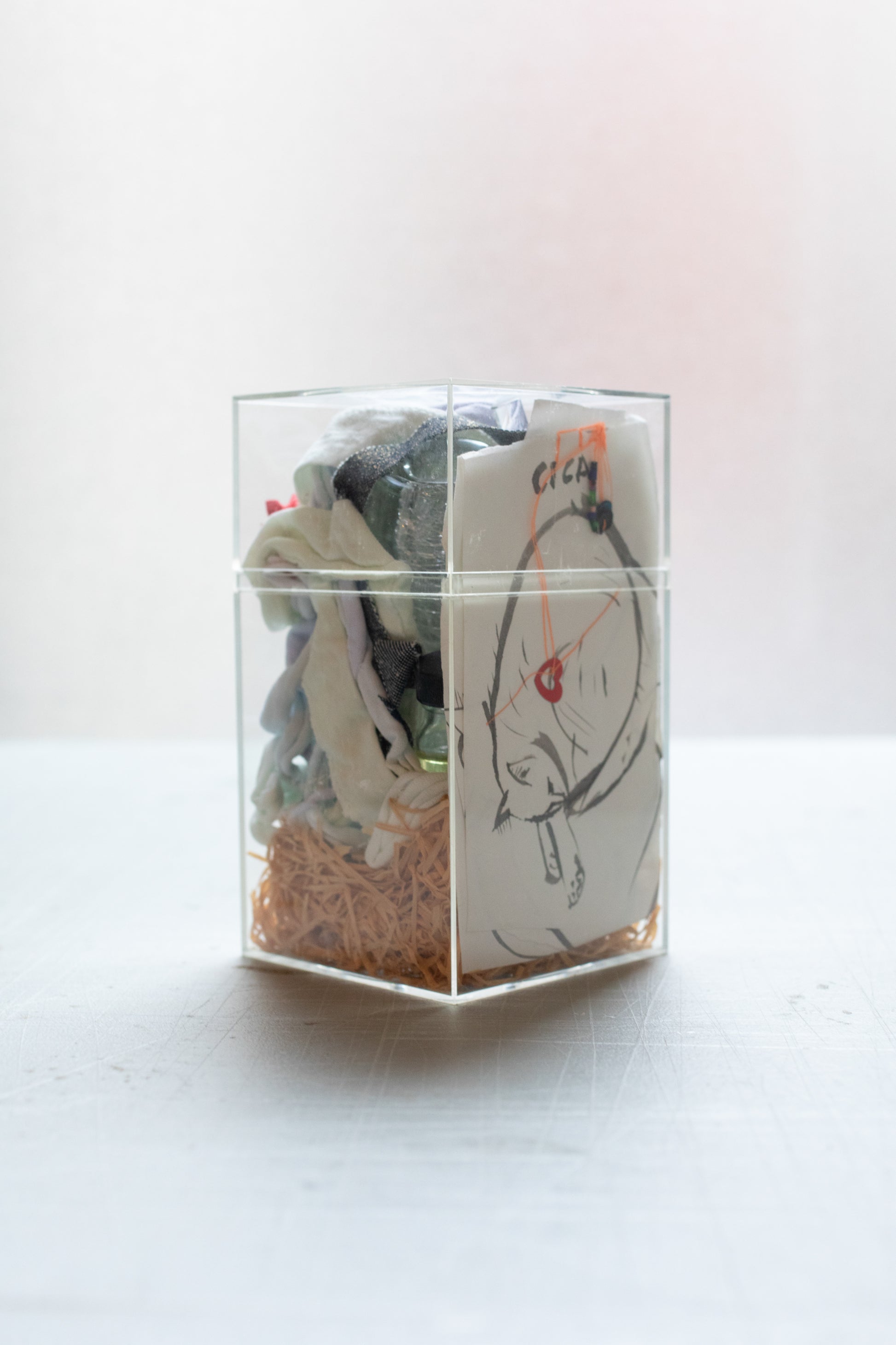 - RUN 9 clothing scraps, drawing of Susan's cat Cica, unique hand blown glass bottle and dauber, perfume vial with scent by Susan Cianciolo and Jennifer Hamadan comprised of essential oils, wood pulp shavings, plexiglass container
