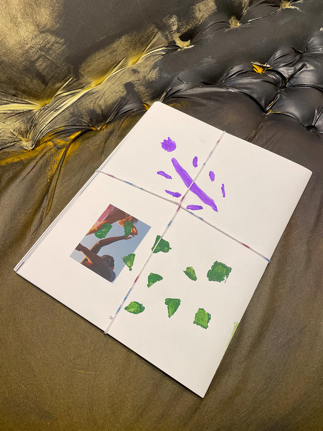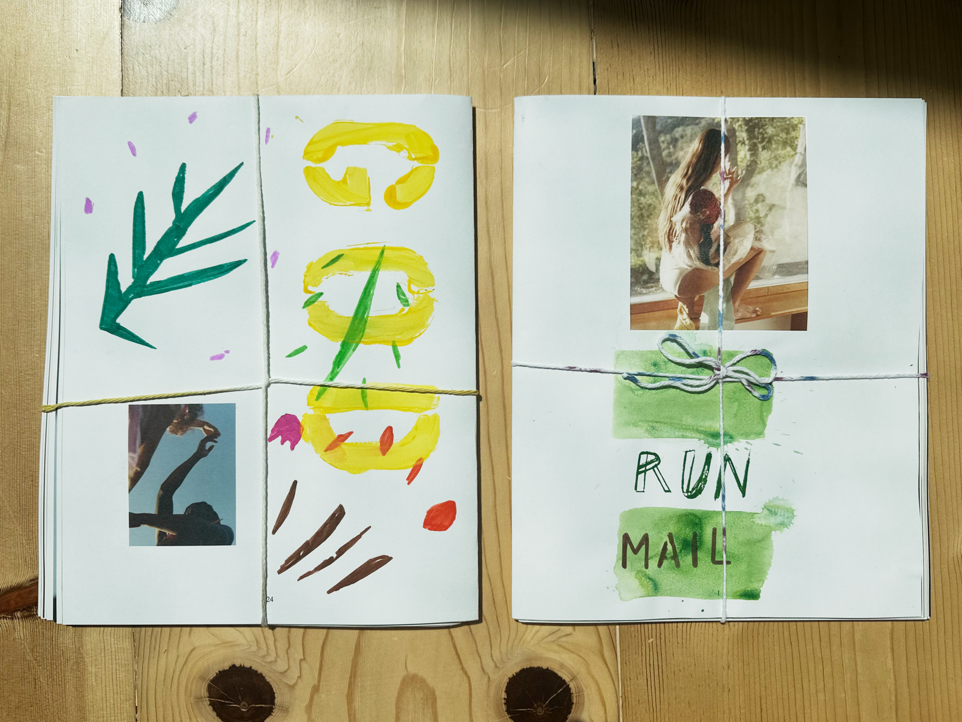 Run Mail by Susan Cianciolo & Clara Balzary. 6 inkjet on paper posters with watercolor, acrylic, collage on paper folded and tied to be a 24 page booklet